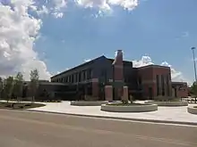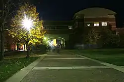The university's main and original campus in Allendale is the site of most of the university's programs. The Allendale campus is composed of 1,322 acres perched above the Grand River next to a system of ravines and is divided into two areas, north and south campus, separated by West Campus Drive.[27][28] State highway M-45 links the campus in suburban Allendale to US Highway 31/Lake Michigan to the west and Grand Rapids, Michigan to the east. Lubbers Stadium, the GVSU Fieldhouse and all other athletic facilities for the school's 19 varsity sports are also on the Allendale campus. The campus is dotted with many sculptures, including works by Dale Eldred, Joseph Kinnebrew and James Clover. Academic facilities on the Allendale campus include 122 classrooms, 144 research laboratories, 20 lab prep rooms, 21 computer labs, and the Mary Idema Pew Library Learning and Information Commons.[29] The Allendale campus is also home to the Kindschi Hall of Science, a science facility that opened in the fall of 2015.[30]