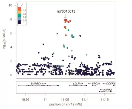 The goal of elucidating pathophysiology has also led to increased interest in the association between risk-SNPs and the gene expression of nearby genes, the so-called expression quantitative trait loci (eQTL) studies.[52] The reason is that GWAS studies identify risk-SNPs, but not risk-genes, and specification of genes is one step closer towards actionable drug targets. As a result, major GWA studies by 2011 typically included extensive eQTL analysis.[53][54][55] One of the strongest eQTL effects observed for a GWA-identified risk SNP is the SORT1 locus.[39] Functional follow up studies of this locus using small interfering RNA and gene knock-out mice have shed light on the metabolism of low-density lipoproteins, which have important clinical implications for cardiovascular disease.[39][56][57]