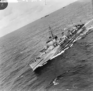 Griffin and Hotspur were transferred to the Eastern Fleet in February 1942. Havock, Hasty, and Hero participated in the Second Battle of Sirte on 22 March during which the former was damaged. While under repair at Malta, she was further damaged and was then ordered to Gibraltar for repairs in a safer environment.[60] Whilst in transit, she ran aground off the Tunisian coast during the night of 5/6 April due to a navigational error and had to be destroyed to prevent her capture.[61] Together with the destroyers Eridge and Hurworth, Hero sank U-568 on 28 May.[62] To reinforce the escorts for Operation Vigorous, a convoy from Alexandria to Malta in June, Griffin and Hotspur were temporarily recalled to join their sisters. During the mission, Hasty was torpedoed by a German E-boat and had to be scuttled by Hotspur on 15 June. On 30 October, Hero shared the credit for sinking U-559 with five other destroyers and a Vickers Wellesley bomber of No. 42 Squadron RAF. Griffin arrived home that same month to begin her conversion into an escort destroyer. Garland remained in the North Atlantic until December 1943 when she began escorting convoys between Freetown and Gibraltar.[63]