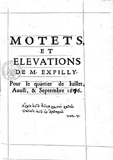 - Motets et élévations de M. Expilly. Pour le quartier de juillet, aoust et septembre 1666. [Paris, Robert III Ballard], 1666, in-4°[8] digitalized on Gallica.