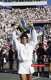 Gabriela Beatriz Sabatini (Spanish pronunciation: [gaˈβɾjela saβaˈtini]; born 16 May 1970) is an Argentine-Italian former professional tennis player.[1] A former world No. 3 in both singles and doubles, Sabatini was one of the leading players from the mid-1980s to the mid-1990s, amassing 41 titles. In singles, Sabatini won the 1990 US Open, the Tour Finals in 1988 and 1994, and was runner-up at Wimbledon 1991, the 1988 US Open, and the silver medalist at the 1988 Olympics. In doubles, Sabatini won Wimbledon in 1988 partnering Steffi Graf, and reached three French Open finals. Among Open era players who did not reach the world No. 1 ranking, Sabatini has the most wins over reigning world No. 1 ranked players.[2] In 2006, she was inducted into the International Tennis Hall of Fame and in 2018 Tennis Magazine ranked her as the 20th-greatest female player of the preceding 50 years.