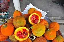 The aril surrounding gấc seeds when the fruits are ripe is cooked with sticky rice to make xôi gấc, a traditional Vietnamese dish in red color served at weddings and New Year celebrations. In addition, the immature green fruit is also used as a vegetable in India.[9] The spiny skin is removed and the fruits are sliced and cooked sometimes with potato or bottle gourd. In Sri Lanka, gấc is used in curry, and in Thailand, gấc is served with ice cream.[10]