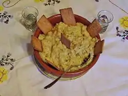 The gachas manchegas or gachas de almorta are cooked with flour made from grass peas (Lathyrus sativus).[4] Accompaniments for the dish vary throughout La Mancha. It was generally consumed during the cold winter months. The dish is generally eaten directly out of the pan it was cooked in, using either a spoon or a simple slice of bread.