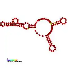 GadY RNA (previously named IS183 in [1]) is a non-coding RNA. The GadY gene is located on between and on the opposite strand to the GadX and GadW genes. GadY can form base pairs with the 3' UTR of its target mRNA gadX, this pairing is thought to confer increased stability to the transcript, allowing accumulation of gadX (a transcriptional regulator of the acid response) and therefore increased expression of downstream acid resistance genes.[2] The GadY gene produces three overlapping transcripts that differ in length. The long form is 105 nucleotides in length and two processed versions are 59 and 90 nucleotides in length. It has been shown that all three forms of GadY bind to the Hfq protein.[2]