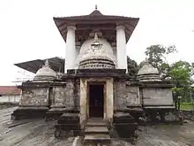 The central temple building is unique in that it is built entirely of sculptured granite, except for two shikharas which are built of brick, and sits on a massive stone slab.[1] The sikharas, which are located above the sanctum begins in an octagonal shape but has been given the features of a dagoba. After the original construction of the temple building, possibly in the 18th or 19th century, a multi-tiered and tiled Sinhalese roof, resting on brick piers and wooden pillars, was added to the temple, concealing the flat roof and the shikharas.[3]