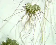 The genus is described as the early offshoot of hemionitid ferns, and is most closely related to genus Aspidotis.[4] Following the characteristics of most ferns, the Gaga group is homosporous in nature, and produce minute spherical spores that travel and fall down on the ground. They later germinate into heart-shaped gametophytes. The thesis on the species explained that "These independent little organisms can be female, male or even bisexual, depending on growth conditions and what other kinds of gametophytes are around. When conditions are right, they exchange sperm between gametophytes, but when necessary they sometimes can also self-fertilize to produce a new fern."[3]