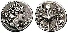 After Sulla emerged victorious, the senate authorized Flaccus to strike coinage to cover expenses for his final months in command. Many examples of this military issue have survived. In 82, to commemorate his victories, the mint in Massalia issued a denarius depicting a winged bust of Victory and a caduceus on the obverse.[45] The reverse shows a legionary aquila flanked by military standards. The one on the left is marked with an H (for Hastati, spearmen), the one on the right P (Principes, also a term for spearmen). Below is EX.S.C, for ex senatus consulto, "by decree of the senate". On the left appears C.VAL.FLA, for the name Caius Valerius Flaccus, with IMPERAT (for imperator) on the right.[46] Flaccus's coin is modeled after a Sullan type, and the symbolism of coins minted in Hispania and Gaul during the period frequently advertised "legitimacy and military success".[47] The output has been estimated at 540,000 denarii coins.[48]