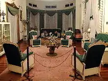 Most of the fixtures and furniture inside the house are of American and European origins. The crafted wooden pieces of furniture was designed and manufactured by Manila's leading furniture atelier, Don Gonzalo Puyat. Exquisite table wares are also on display and large wall mirror greets every visitor in the receiving area. A 19th century grand piano is also in the receiving area complemented by a vintage wooden radio in one corner of the room.