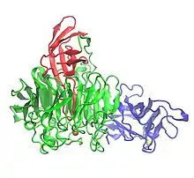 ![]() Crystal structure of galactose oxidase showing three domains: Domain 1 (blue), Domain 2 (green), and Domain 3 (red) | |||||||||