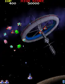 Atop each formation are four larger enemies known as the Boss Galaga, which take two hits to destroy.[3] These aliens use a tractor beam to capture a player's ship, returning with it to the top of the screen.[3] The player can reclaim the captured fighter by shooting a Boss Galaga holding one while it is divebombing. If they are successful, the captured fighter joins with the player's own to create a dual fighter that has additional firepower and a larger hitbox.[4] A Boss Galaga can also capture a dual fighter; rescuing it in the same fashion instead creates a triple fighter, an even larger ship with wide, fast-moving shots.[4][5] A triple fighter can also be acquired by finding pink-colored capsules.[2]