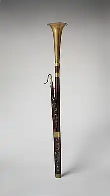 Like all bassoons, it is a double-reed instrument. It has 19 keys and two open holes.[4] The galandronome is tuned in B♭, below the normal bassoon in C and above the semi-contrabassoon in F or G. The only known surviving instrument is found at the Metropolitan Museum of Art in New York City. It carries the engraving “Innové / par Galander / Rue de Constantine 27, / à Paris. / I. C.”[2] It is therefore possible that Galander did not actually invent the galandronome but improved – or innovated – it, possibly based on an instrument of Savary's whose bassoons were widely copied at the time.[1]
