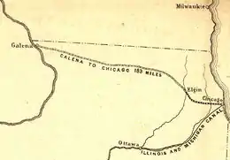 The railroad was constructed starting in March 1848, and was completed to Freeport in 1853. The first westbound train out of Chicago departed on October 25, 1848, pulled by a used Baldwin-built locomotive named Pioneer.[2][3] When construction reached the Fox River at Elgin in 1850 passengers going farther west could transfer to the stagecoach lines. The railroad extended to Rockford by 1851 and ended construction at Freeport in 1853. The Illinois Central Railroad, using the G&CU construction crew, completed the Freeport to Galena route in 1854 following the stage route already established by Frink, Walker and Company.