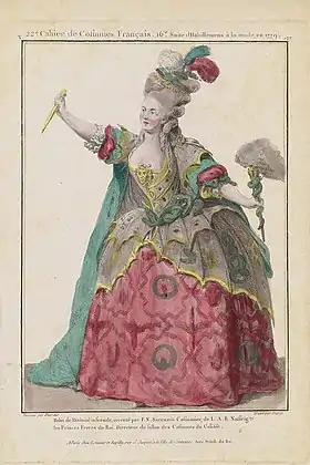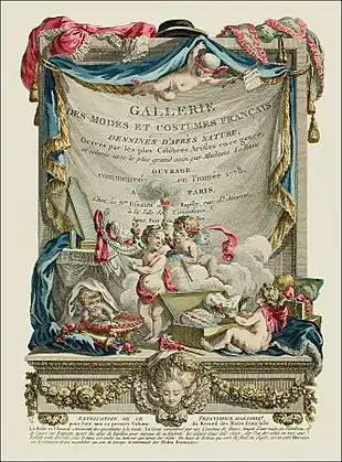 Galerie des modes was conceived during the final decades of the 1700s, a period when France was at the forefront of fashion innovation. To quote the historian James Laver, at this time "fashionable clothes...meant French clothes."[2] This supreme influence was undoubtedly strengthened by Queen Marie Antoinette as well as figures such as Rose Bertin (her dressmaker) and Monsieur Léonard Autié (her hairdresser) who were responsible for designing her iconic courtly wardrobe.[3] Beginning in the 1770s (the decade during which Antoinette both married future king Louis-Auguste and assumed the title Queen of France and Navarre), women's dress came to exhibit greater variation than ever before; the fashion plate emerged under these conditions, as if to disseminate each budding trend.