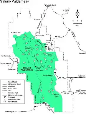 The range is noted for its height and ruggedness. The Aravaipa Canyon Wilderness encompasses the north perimeter of the range, and the large Galiuro Wilderness covers the central-south. To the south, the Galiuro Wilderness borders the Redfield Canyon Wilderness. A river valley borders the range to the southwest, and Aravaipa Creek and Valley border its northeast.