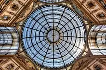 The Milan gallery and its roof have been acknowledged as an important reference on 19th-century iron-and-glass architecture by Pevsner[3] and Hitchcock.[4] As one can still observe today, the roof consists of four barrel vaults (approximately 14.5 m in width and 8.5 m in height) that are crowned with a huge dome (around 37.5 m as internal diameter and 17.10 m in height).[5] Jorini pointed out the accomplishments of this dome with special regard to the large dimensions.[6] Each of the roof parts is topped with a lantern.