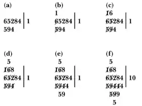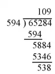 - (omitted) Dividing 5884 by 594 yields 9 which is written as the new digit of the quotient. 58 − 5×9 = 13 so cross out the 5 and 8 and above them write 1 and 3. Cross out the 5 of the divisor. The resulting dividend is now 1384. 138 − 9×9 = 57. Cross out 1,3, and 8 of the dividend and write 5 and 7 above. Cross out the 9 of the divisor. The resulting dividend is 574. 574 − 4×9 = 538. Cross out the 7 and 4 of the dividend and write 3 and 8 above them. Cross out the 4 of the divisor. The resulting dividend is 538. The process is done, the quotient is 109 and the remainder is 538.