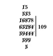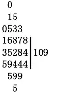 - (b) Compute 6 − 5×1 = 1. Cross out the 6 of the dividend and above it write a 1. Cross out the 5 of the divisor. The resulting dividend is now read off as the topmost un-crossed digits: 15284.
