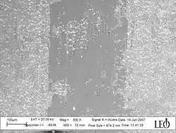 Galling is a form of wear caused by adhesion between sliding surfaces. When a material galls, some of it is pulled with the contacting surface, especially if there is a large amount of force compressing the surfaces together.[1] Galling is caused by a combination of friction and adhesion between the surfaces, followed by slipping and tearing of crystal structure beneath the surface.[2] This will generally leave some material stuck or even friction welded to the adjacent surface, whereas the galled material may appear gouged with balled-up or torn lumps of material stuck to its surface.