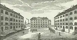 In July 1798, The West Lowland Fencibles[9] arrived in Glasgow Barracks. Soldiers of the York and Cheshire regiments were also in the Barracks that year. A year later, nearly 300 men of the Nottinghamshire Militia,[10] quartered in Glasgow Barracks, volunteered their services into Regiments of the Line, for European service.[11]