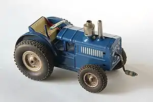 Gama also made tin friction and plastic cars through the 1960s, like the 1950s Auto Union look-alike which was not very clever in form – having a 'flattened' driver stamped into the metal. Later tinplate vehicles like the 1950s Cadillac and Aston Martin were fairly accurate compared to the real cars. Trucks and motorcycles were also made – usually around 10 inches long, but many were smaller. One example made around 1950 was a 6 inch long motorcycle ridden by a chimp in a circus suit. Many were wind-up/clockwork in operation. Other more traditional toys, like a donkey ridden by a clown – or more fantastical, like spaceships, were also produced.