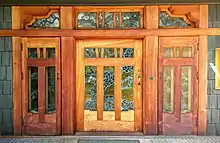 On the west wing of the house, the dining room is surrounded by the terrace and the garden on three sides. According to Gamble House: Greene and Greene, by Edward R. Bosley, the room was designed to offer "nature to the indoors."[4] The entrance of the room is diagonal from the hall with two doors. The doors are decorated with cloud-designed glass panels. The transition from hall to room was designed to provide a sense of "anticipation and discovery".[4]