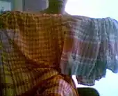 Gamcha (Bengali: গামছা), also known as Gamchha, Gamucha and Gamusa, is a sort of traditional thin, coarse cotton plaid or turban fabric,[1] sometimes with a checked design, found in east India, Bangladesh, as well as in eastern Terai of Nepal. It also became bit popular in other cultures of India and now in what is known as Pakistan after the Indian partition, as well as various parts of South and Southeast Asia.The word "Gamcha" is Bengali word which comes from two very simple and commonly used Bengali words, (গা) ga which means "Body", and (মুছা) mucha which means "wipe". Literally translated, it means 'something to wipe the body with' however, interpreting the word gamcha as the towel is misleading.[2] It is often worn on one side of the shoulder. Its appearance varies from region to region, and it has been traditionally worn as a scarf by the Odia men and Bengali men. Gamcha is also a headwear for Bengali men especially rickshaw pullers in Bangladesh because it sokes all the sweats.[3] Gamucha was also mentioned in Odia Mahabharata by Sarala Dasa as part of the traditional dress of Odia men.[4][5][6] Weavers of traditional tantubaya or jugi community migrated from Bangladesh to Tripura and weavers of Odisha produce good quality gamucha.[7] This is also used as turban and cotton towel in Punjab. They call it parna.