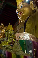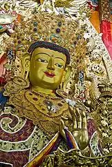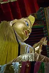 In the main hall of the monastery, more than 1500 monks congregate to recite the Buddhist scriptures. This hall houses a plethora of scriptures written on palm leaves, a gilded statue of Shakyamuni Buddha which is 8 metres (26 ft) tall at the main altar along with paintings depicting the life of Buddha. The altar has permanent decorated by yak butter lamps.[5][15]
