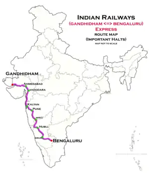 The 16505/16506 Gandhidham–Bangalore City Express is an Express train belonging to South Western Railway zone that runs between Gandhidham Junction and Bangalore City in India. It is currently being operated with 16505/16506 train numbers on a weekly basis.[1][2][3]
