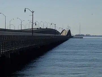 By 1947, state Sen. Raymond Sheldon described the bridge as "outmoded, too narrow and a traffic bottleneck."[8] In 1956 a second slightly higher, fixed span was added to the Gandy Bridge to serve westbound traffic. The first span would then serve eastbound traffic until 1975. The second bridge remained in use until February 1997.