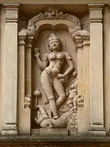 Ganga has been revered in Cambodia since the Khmer empire. In Shiva's iconographical form Uma-Gangapatisvarar (Khmer: ព្រះឧមាគង្គាបតិស្វរ), Shiva is depicted with Ganga and his wife Uma (Parvati). Ganga's images are located in Bakong, Lintel in Thommanon and exhibit in International Council of Museums.[26][27]