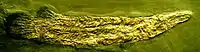 The Florida gar (Lepisosteus platyrhincus) can be found in the Ocklockonee river, Florida, and Georgia,[35][36] and prefers muddy or sandy bottoms with bountiful vegetation.[35][37] It is commonly confused with its cousin, the spotted gar.[35] Uneven black spots cover its head, body, and fins.[35][36] Green-brown scales run along the back of its body, and the scales on its underbelly are white or yellow.[35][38] This coloration, which blends well with the gar's surroundings, allows it to ambush its prey.[35][38] The Florida gar has no ganoid scales on its throat.[35] Female Florida gars grow to lengths between 13 and 34 inches, bigger than their male counterparts.[35][38]