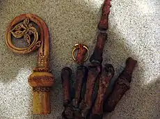 It was only in 1926 that excavations discovered the foundations of the cathedral and the surrounding Norse buildings. Excavations were carried out by Danish archeologist Poul Nørlund. On the site, a number of walrus skulls and narwhal were discovered, suggesting that the area near the cathedral included a pagan temple. Amongst the most famous excavations include a number of graves, notably a grave of a bishop which was buried in the north chapel of the cathedral. The skeleton discovered was that of a powerfully built middle-aged man. In his hands, a Crosier made of ashwood and decorated with walrus ivory was discovered and a gold ring on the finger.[8] It is believed that the body belongs to one of Greenland's most famous bishops, Jón Árnason's, or Smyrill who died in 1209, as well as any other of the Norse bishops from the thirteenth-century. A bell was also excavated which may have been part of the cathedral tower.