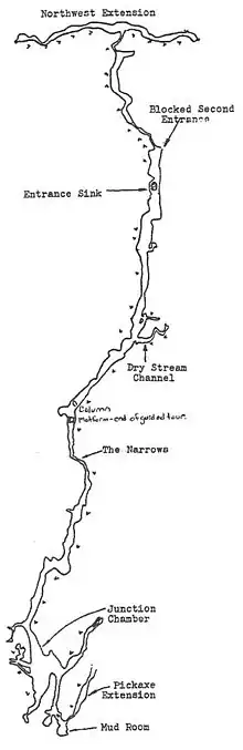 The cave is adorned with stalactites, stalagmites, flowstone, pools, and a column 2 feet in diameter.[4]