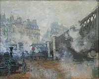 This Impressionist series was deeply influenced by modernization and industrialization in the nineteenth century, presenting a busy train station in different times of a day.[1] Monet finished the Gare Saint-Lazare series in the first half of 1877 and exhibited seven of the twelve paintings at the Third Impressionist Exhibition in the same year.[2] Today, the Gare Saint-Lazare paintings are scattered in institutions all over the world, including Musée d'Orsay, Fogg Art Museum, Art Institute of Chicago, National Gallery, Musée Marmottan Monet, Pola Museum of Art, Lower Saxony State Museum, and other private collections.