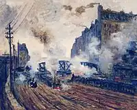 In the 1870s, Monet rented a studio not far from the Gare Saint-Lazare and gained permission from the director of the Compagnie des Chemins de fer de l'Ouest to paint from the station concourse and beside the track.[3]