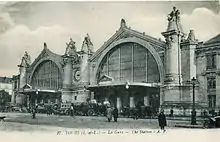 The first railway station for Tours (called L’Embarcadère) was built in 1846 by Phidias Vestier, on the site of the current Place du Général-Leclerc, Tours, like Orléans, having accepted service rail late.[3] It is operated by the Compagnie du chemin de fer de Paris à Orléans. The Vendée station, serving Les Sables-d'Olonne, was built on behalf of the Compagnie des chemins de fer de la Vendée in 1875, west of the first station.[4]