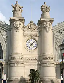The current passenger building was built between 1896 and 1898 under the direction of tourangeau architect Victor Laloux, with four allegorical limestone statues of cities by Jean Antoine Injalbert (Bordeaux and Toulouse) and Jean-Baptiste Hugues (Limoges and Nantes). The purpose of this project was to merge the equipment of Paris-Orléans and the State Railways (which had acquired the Chemins de fer de la Vendée). It has been listed as a monument historique since 28 December 1984.[5]