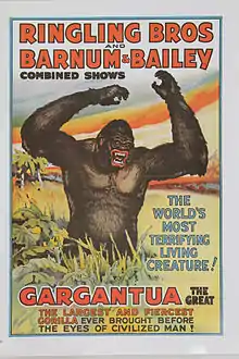 Gargantua (1929 - November 1949) was a captive western lowland gorilla famed for being exhibited by the Ringling Brothers circus. He has been credited with saving the business from bankruptcy. An acid scar on his face gave Gargantua a snarling, menacing expression, which the circus management exploited by generating publicity falsely exaggerating his purported hatred of humans. He was also claimed to be the largest gorilla in captivity.