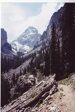 Garnet Canyon is located in Grand Teton National Park in the U.S. state of Wyoming.[2] The canyon was formed by retreating glaciers which reached their last glacial maximum around 15,000 years ago.[3] While Garnet Canyon is a less popular destination for recreational hikers than nearby Cascade Canyon or Death Canyon, it is an important approach to many significant and popular mountaineering climbs including routes found on Grand Teton, Middle Teton, South Teton and Disappointment Peak.[4]