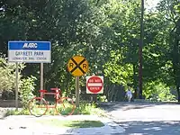 Garrett Park was an early planned community, originally promoted by businessman Henry W. Copp, who purchased the land in 1886. Copp wanted to build a suburban development reminiscent of an English village, and even went so far as to name the streets after locations in the novels of the English author Walter Scott, such as Kenilworth and Strathmore. Copp worked in conjunction with the Baltimore and Ohio Railroad, which in 1893 built a train station.[3] Builders were given reduced rates to transport workers and materials to the town site, and new residents were given free trips to move in. The town lies along the former B&O railway corridor (now used by CSX, Amtrak, MARC). It was named for John Work Garrett, who had led the B&O for nearly three decades, including the American Civil War. Copp limited commercial development in the community. Today the Town has a 4-star restaurant, post office, and farmer's market. Garrett Park incorporated as a town in 1898, at which time it had thirty buildings and approximately 100 residents.[4] However, rail suburbs did not catch on, and the community stagnated as automobiles replaced commuter trains and streetcars. In the 1920s, another company built approximately 50 more houses, now including garages.[5] Sections of the town are included in the Garrett Park Historic District, listed on the National Register of Historic Places in 1975.[6] For example, Garrett Park's first school house, designed in 1928 by prominent local architect Howard Wright Cutler and now preserved as part of a residential home, is a designated historic site by the Maryland Historical Trust.[7] In 1977, the Town became a declared arboretum, maintaining a tree inventory of all town trees and a scheduled tree planting schedule. In May 1982 the townspeople of Garrett Park voted 245 to 46 to ban the production, transportation, storage, processing, disposal, or use of nuclear weapons within the town. This made Garrett Park the first nuclear-weapons free zone in the United States.[8]