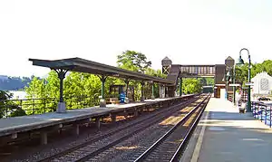 Rail service in Garrison can be traced as far back as the 1850s with the Hudson River Railroad. Prior to this, the only major transportation in the community was the ferry to West Point.[2] Garrison Landing was built around the station, which, along with the line, was acquired by the New York Central and Hudson River Railroad (NYC&HR) in 1864, and like many others on the Hudson Line, it is also right on the Hudson River. In 1892, NYC&HR rebuilt the station with elements of the Italianate, Victorian Gothic and Hudson River Bracketed styles, similar to stations such as Dobbs Ferry. On October 24, 1897, the Garrison train crash occurred 1.75-mile (2.82 km) south of the station at Kings Dock resulting in 19 deaths (mostly from drowning) and hundreds of injuries. A pedestrian tunnel was added to the station beneath the tracks in 1929. In April 1945, the station was a stop on the funeral train of Franklin D. Roosevelt, where West Pointers could pay tribute to the dead president as his body was transported to Hyde Park.[3]