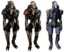 Garrus is a turian, an alien race with avian features, from a society which values discipline and possesses a strong sense of personal and collective honor.[2] Turians resemble "humanoid birds or raptors"; they have an eagle-like head with the crest of a plumed bird, avian legs with bones jutting from their calves, and a carapace on their shoulder blades which protects them from the radiation on their homeworld Palaven.[3] Design wise, Garrus wears a visor and has a blue-and-black theme to his armor. In Mass Effect 2, while in Omega, Garrus is seriously injured by a gunships's chain gun and rockets and so gains scars and a cracked armor.