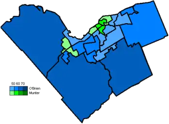 In the end, Munter could only win his core areas in the central part of the city, plus his former home of Kanata, while O'Brien won the rest of the city—suburban areas and the rural areas (where he did especially well). Chiarelli did not win any wards, but he did finish second in Gloucester-South Nepean with 28%. This area of the city was where his O-Train proposal was going to be built.