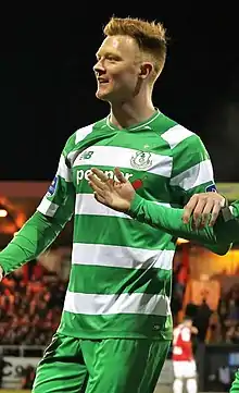 2017 was a brilliant season for Shaw as he scored 11 goals in 28 league games for the Hoops, making 10 further appearances in cup competitions, including all UEFA Europa League qualifiers as the Hoops knocked out Stjarnan of Iceland courtesy of a Shaw winning goal away from home, before being knocked out by Mlada Boleslav of the Czech Republic.[12][4] Rovers bettered their 4th-place finish of the previous season by finishing 3rd, as well as being knocked out of the FAI Cup in a semi-final replay vs Dundalk, having also lost in the League of Ireland Cup Final to the same opposition.[13] At the end of the season, Shaw was named as Shamrock Rovers Player of the Year.[14]