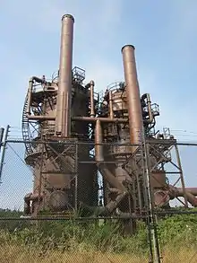 (A): Towers 1 and 2 (largest and closest to the lake) are Semet-Solvay–type generators built in 1937–38. Each has a single outer shell made of welded steel lined inside with refractory brick. Tower 1 is 80 ft (24 m) and Tower 2 is 75 ft (23 m) tall. At their peak they could manufacture 6 million cubic feet (170,000 m3) of gas a day.