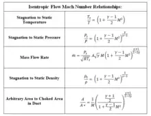 can be obtained, where M is the Mach number and γ is the ratio of specific heats (1.4 for air). See table of isentropic flow Mach number relationships.