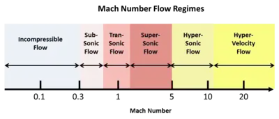 The Mach number (M) is defined as the ratio of the speed of an object (or of a flow) to the speed of sound. For instance, in air at room temperature, the speed of sound is about 340 m/s (1,100 ft/s). M can range from 0 to ∞, but this broad range falls naturally into several flow regimes. These regimes are subsonic, transonic, supersonic, hypersonic, and hypervelocity flow. The figure below illustrates the Mach number "spectrum" of these flow regimes.