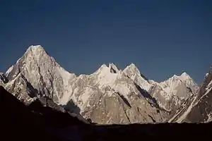 Gasherbrum (Urdu: گاشر برم) is a remote group of peaks situated at the northeastern end of the Baltoro Glacier in the Karakoram mountain range. The peaks are located within the border region of Xinjiang, China and Gilgit-Baltistan, Pakistan. The massif contains three of the world's 8,000 metre peaks (if Broad Peak is included). Although the word "Gasherbrum" is often claimed to mean "Shining Wall", presumably a reference to the highly visible face of Gasherbrum IV, it comes from "rgasha" (beautiful) + "brum" (mountain) in Balti, hence it actually means "beautiful mountain".