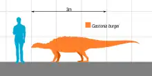 Gastonia was a medium-sized ankylosaur. In 1998, Kirkland estimated its length at six metres.[2] In 2010, Gregory S. Paul indicated a body length of five metres and a weight of 1.9 tonnes.[8] The skeleton mount is 459 centimetres long with a hip height of 112 centimetres.[7]