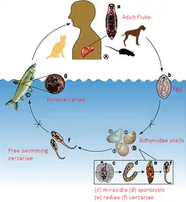 Trematodes (commonly known as flukes) are a subclass of the Trematoda and are obligatory internal parasites.[6] The Digenea consist of around 80 families and 6,000 described species, with only a dozen species known to actively infect humans.[6] The most well-known and predominate gastropod-borne parasitic disease is schistosomiasis, while other less known GPDs include Amphistomiasis, Brachylaimiasis, Clinostomiasis, Clonorchiasis, Dicrocoeliasis, Echinostomiasis, Eurytrematosis, Fasciolopsiasis, Fascioliasis, Haplorchiasis, Heterophyiasis, Metagonimiasis, Metorchiasis, Nanophyetiasis, Neodiplostomiasis, Opisthorchiasis, Paragonimiasis and Philophthalmiasis (commonly grouped as foodborne trematodiasis). Theses trematode diseases cause significant morbidity and mortality in humans, especially in developing countries and have a significant impact on livestock and companion animal health.[7] Both schistosomiasis and foodborne trematodiases are significant public health problem in endemic areas and are identified as a Neglected Tropical Diseases by the World Health Organisation (WHO).[3]
